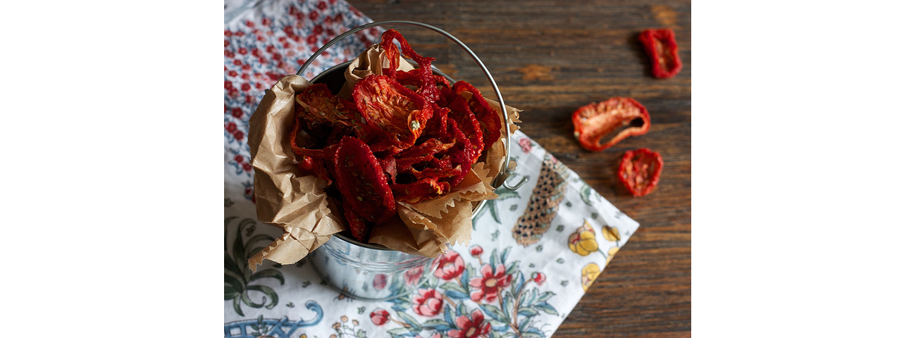 Corta los tomates en rodajas, los puedes salpimentar y luego ponlos en las bandejas del deshidratador Excalibur, deshidrata por 6 horas a 57 °C y listo!